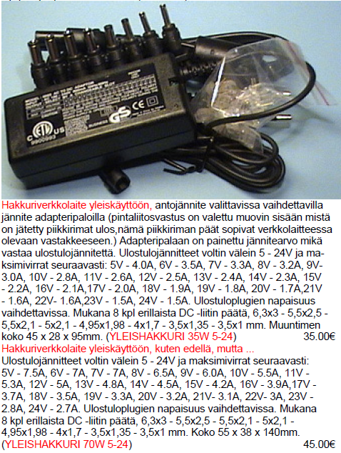 Ostin Spelektroniikasta liitteen mukaisen säädettävän hakkuriverkkolaitteen jolla on helppo saada haluttu jännite ja tehoakin löytyy mukavasti, ainakin suuremmasta mallista.