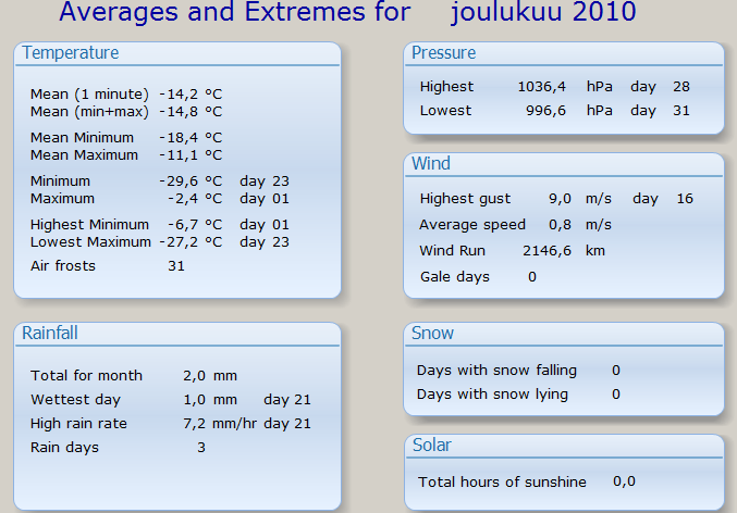 2010: Ylin: - 0,7°C, Alin: -25,2°C, Keskilämpötila: - 9,3°C, Sademäärä:  0,0mm