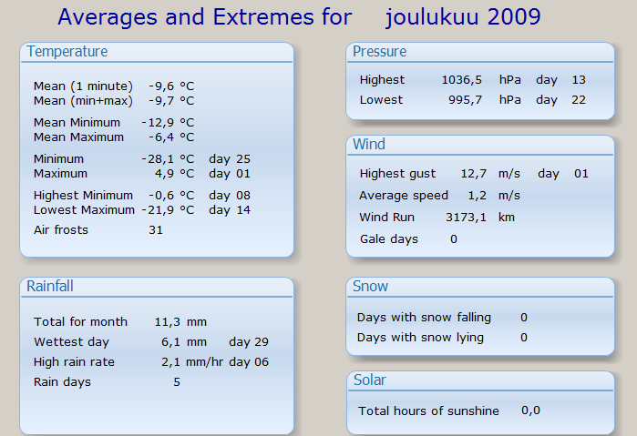 2009: Ylin: + 5,6°C, Alin: -20,2°C, Keskilämpötila: - 5,5°C, Sademäärä: 25,1mm