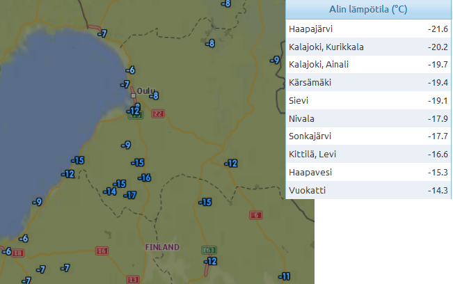 Pakkanen näyttää nyt asustelevan Oulun eteläisellä alueella.