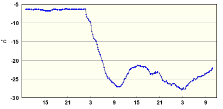 Prikuulleen samanlainen tuli Vuokatin sääasemallekin. Itsekin ensin katsoin, että voiko pitää paikkansa, sillä lämpötila oli ennen tiputusta pysynyt lähes täysin samana jo vaikka kuinka pitkään ja sitten romahti kerralla tonne -30 asteeseen saakka :)